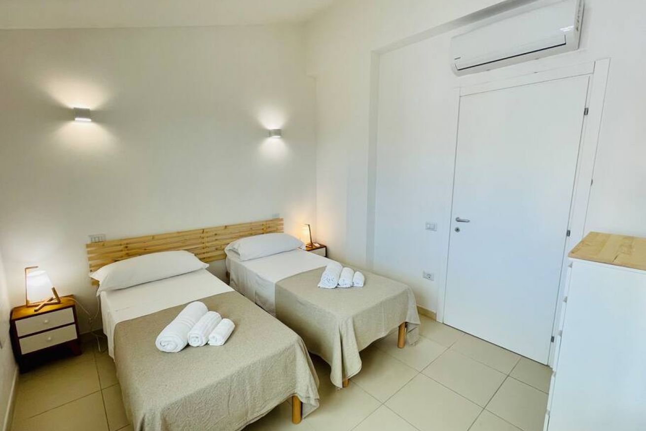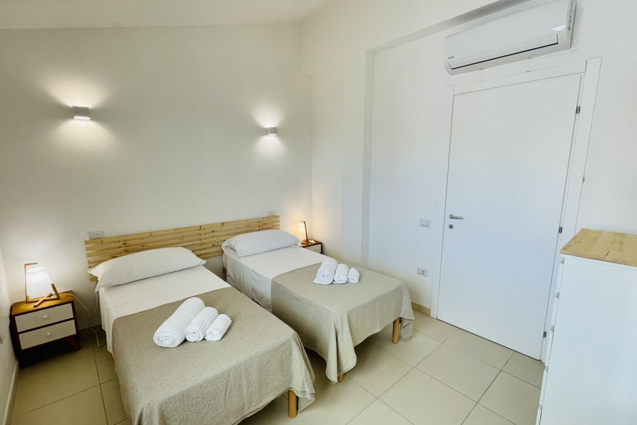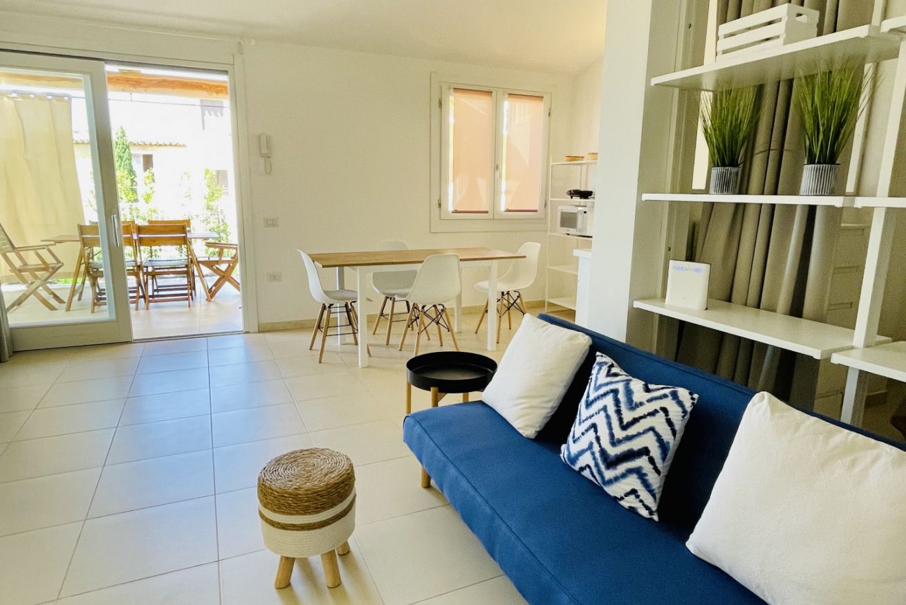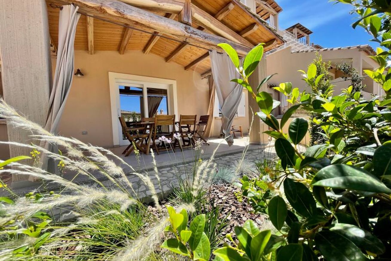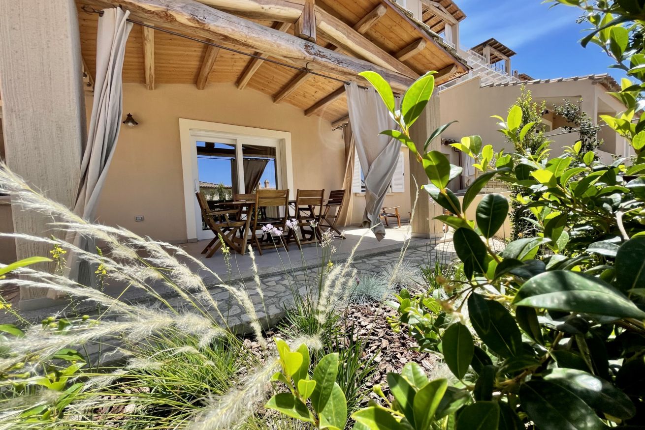 Trilocale su un livello con due camere da letto, due bagni, una zona notte complementare, salone con zona cucina, patio e giardinetto esterno.