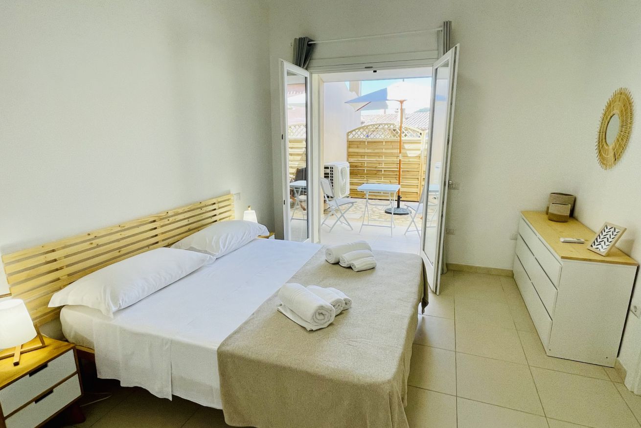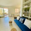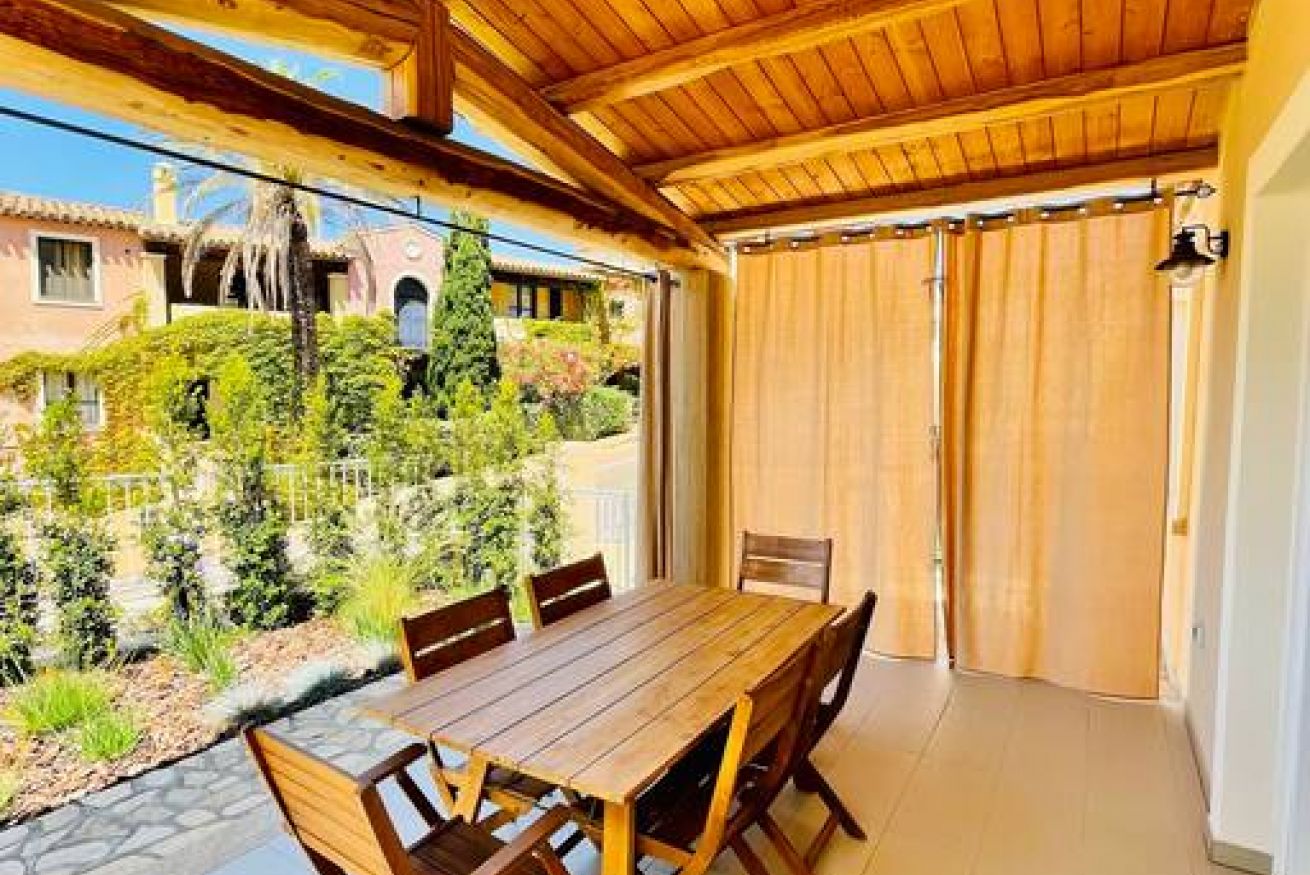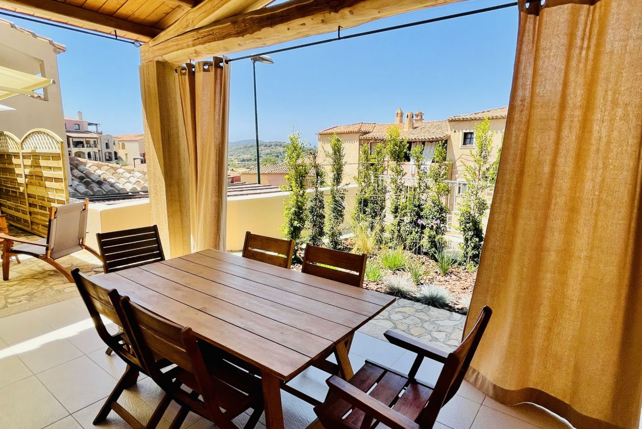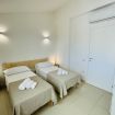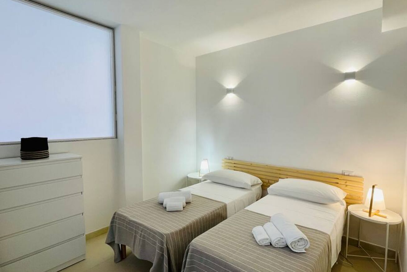 Trilocale su un livello con due camere da letto, due bagni, una zona notte complementare, salone con zona cucina, patio e giardinetto esterno.