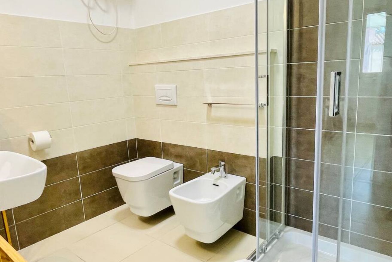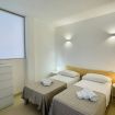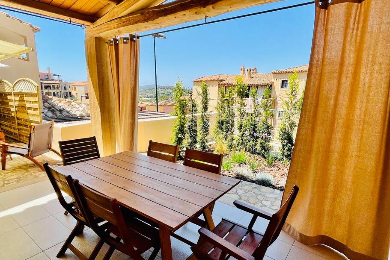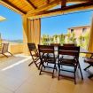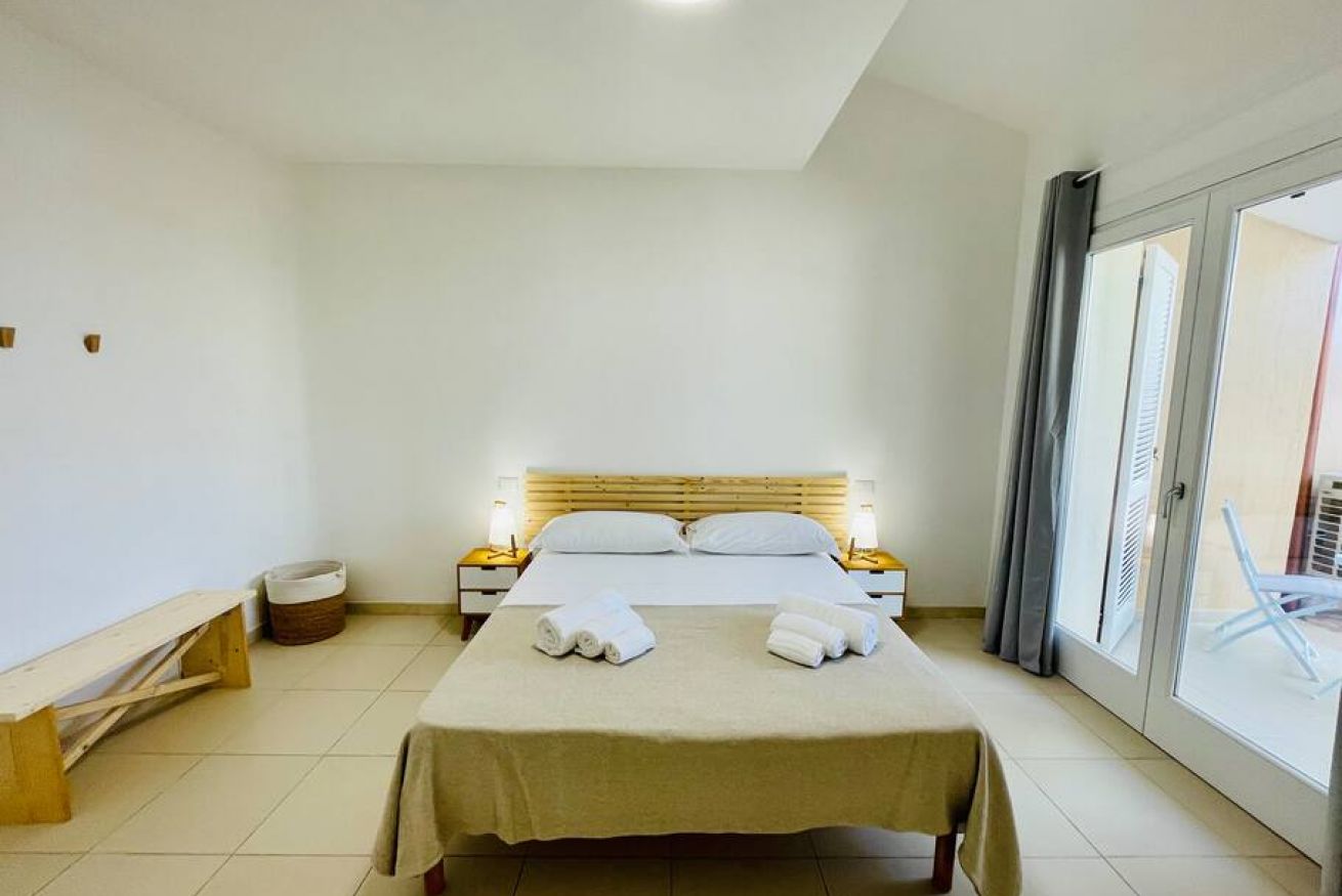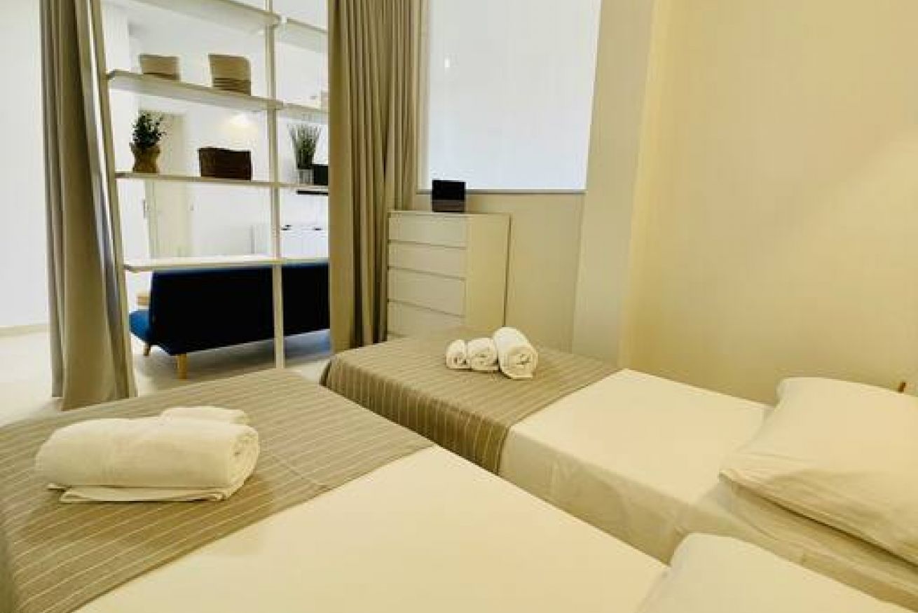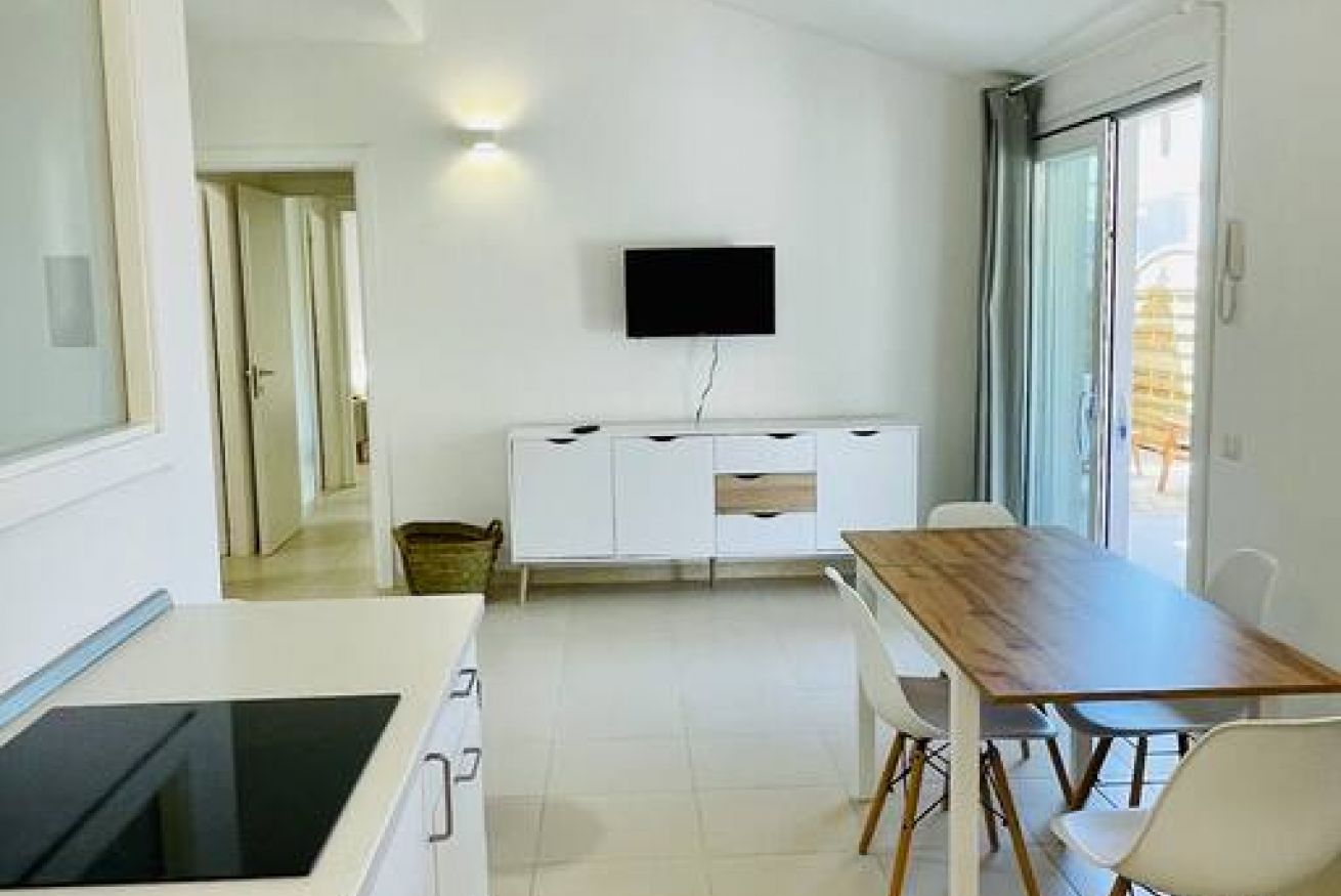 Trilocale su un livello con due camere da letto, due bagni, una zona notte complementare, salone con zona cucina, patio e giardinetto esterno.