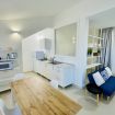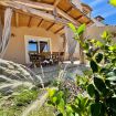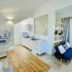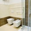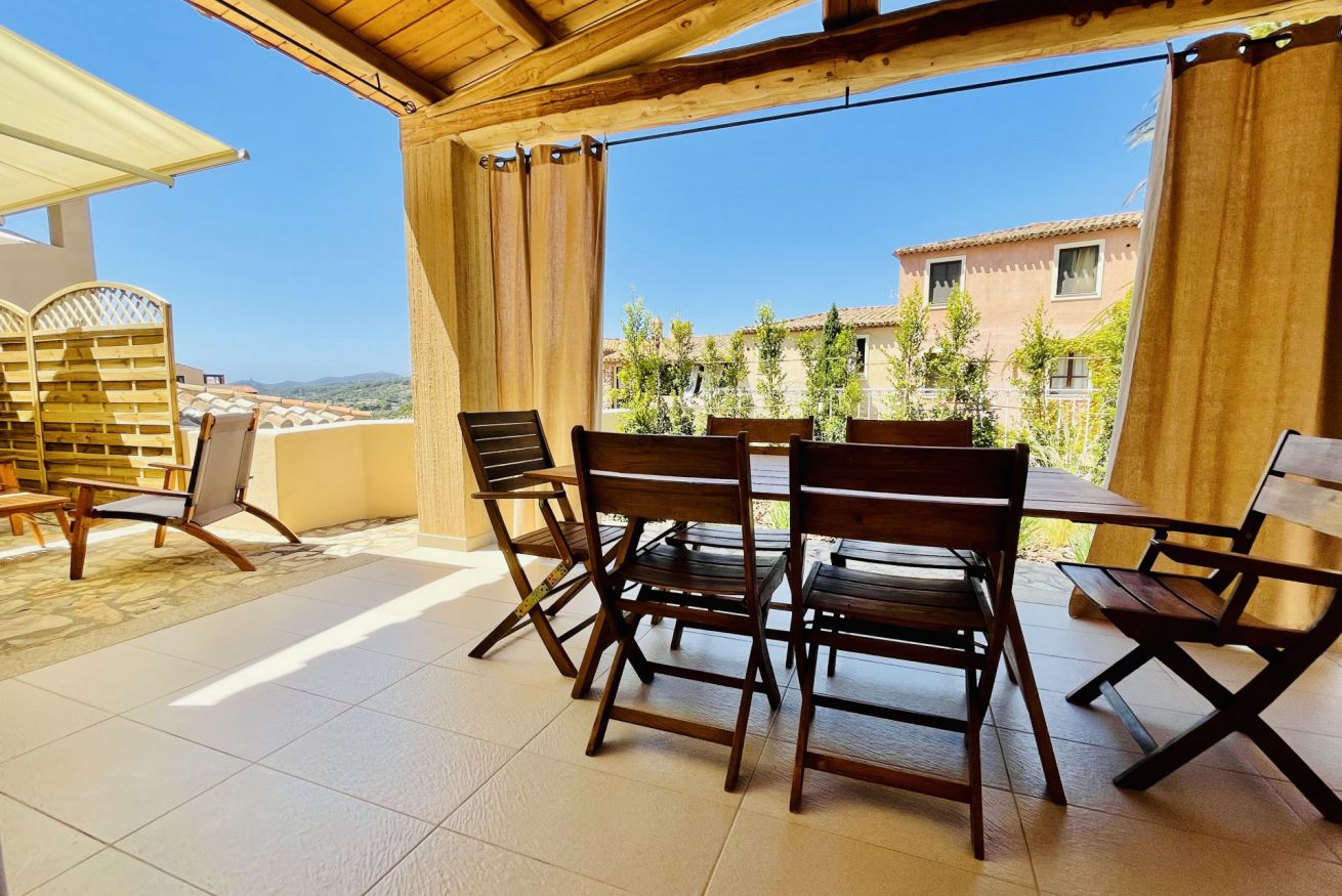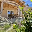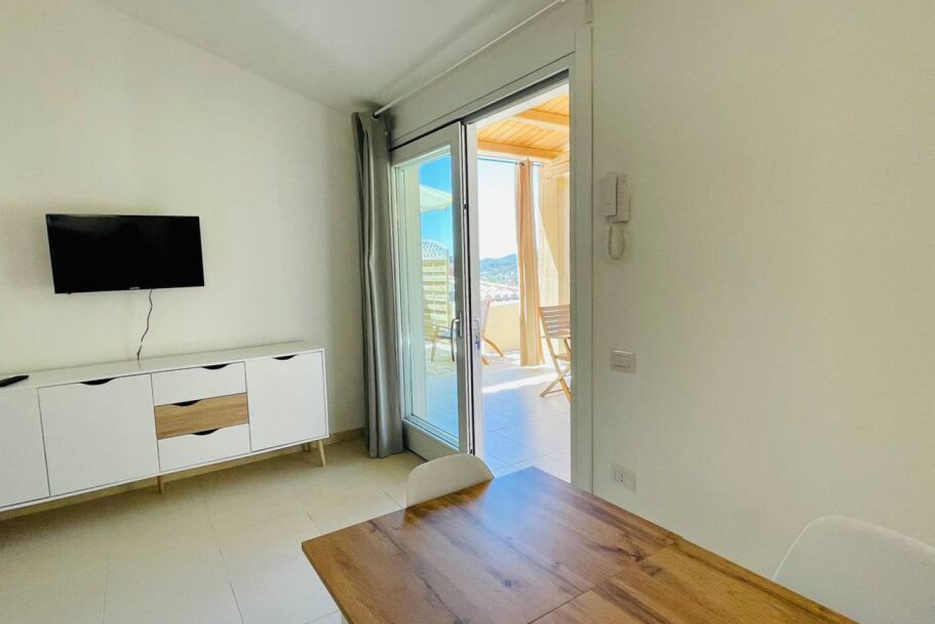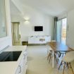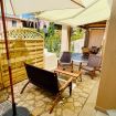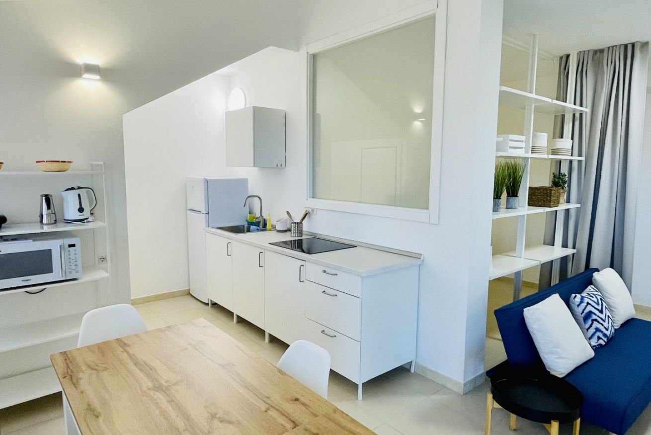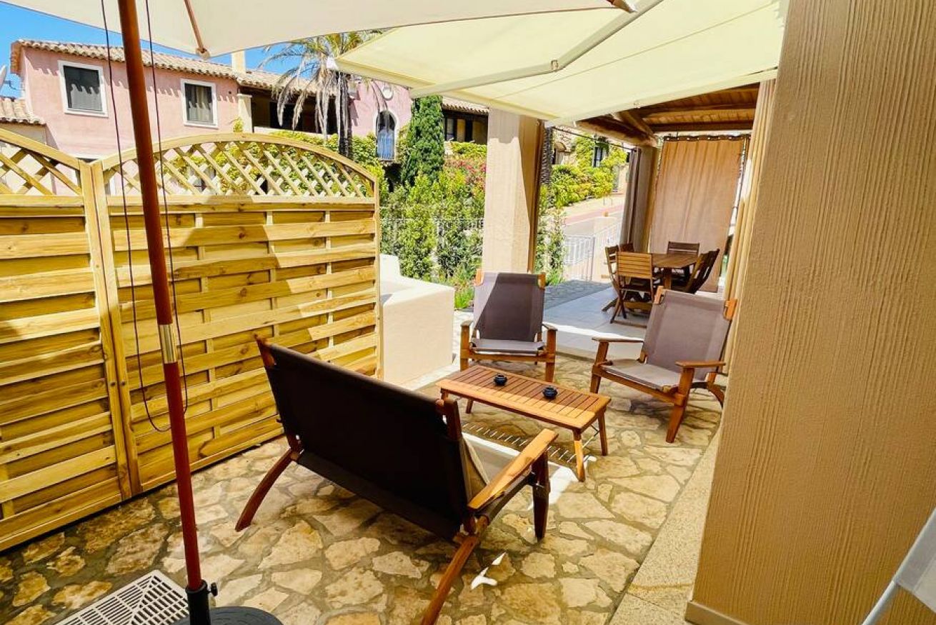 Trilocale su un livello con due camere da letto, due bagni, una zona notte complementare, salone con zona cucina, patio e giardinetto esterno.